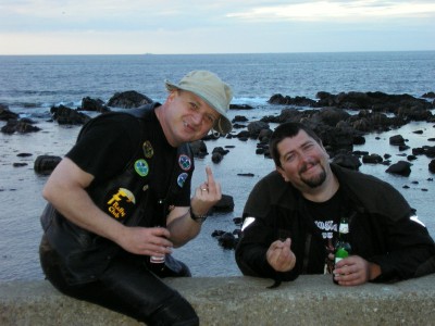Bob N Buddha have a beer after getting the tents up. Arrived in Sandhaven to a warm wind and sunshine, first things first Bob got the beers out and we started to get the tents up. Mission accomplished we had another beer! On opening the panniers I found one of them swimming in water ( it was the one that Buddha had put his stuff in ) I forgot I had a bag of ice for Dr Smirnoff in the same one (oops!!) |
